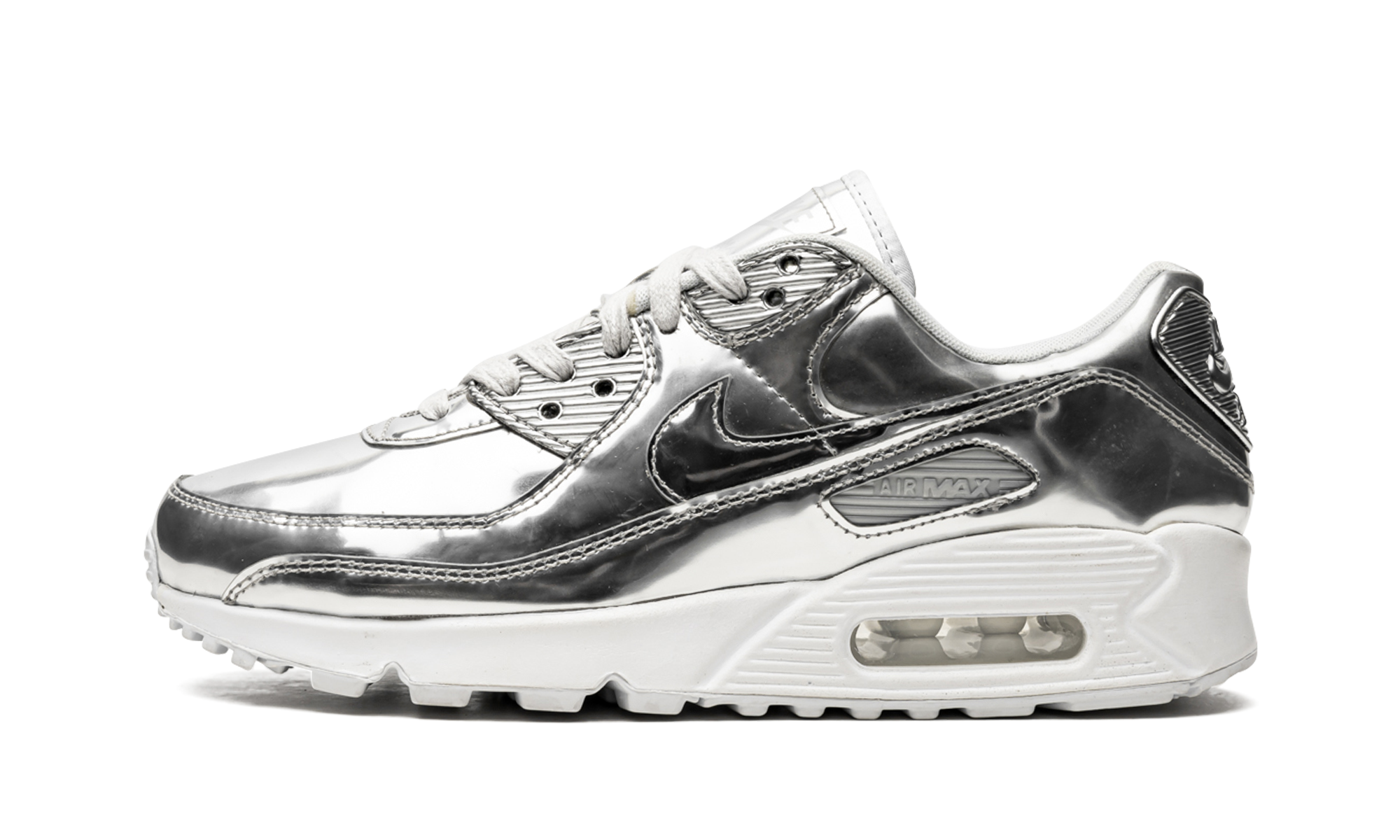 The Women’s Nike Air Max 90 “Metallic Silver” is the women’s sizing of the iconic performance running shoe that was released in March 2020. Celebrating Air Max Day, the colorway seen here is part of a larger Air Max 90 “Metal Pack” that features flashy metallic finishes in gold, silver, and bronze options. The shiny material covers the entire upper, including the Swoosh hit that appears on each side. A Nike Air branding window and additional Nike Air detailing on the heel provide subtle contrasting. The look is finished off with a white midsole with a visible Air unit in the heel. The Women’s Nike Air Max 90 “Metallic Silver” was released on March 26, 2020. Metallic Pack - Silver